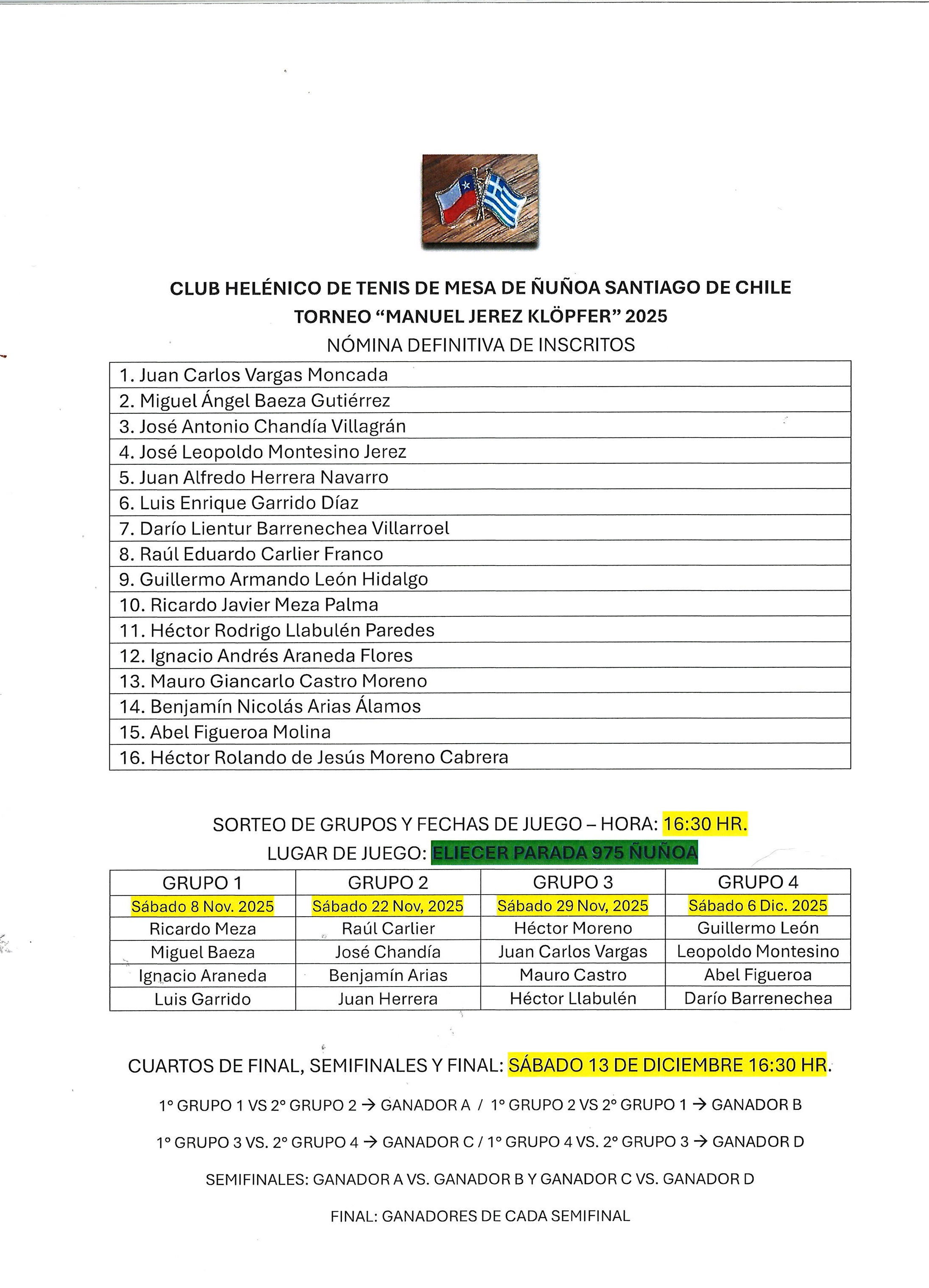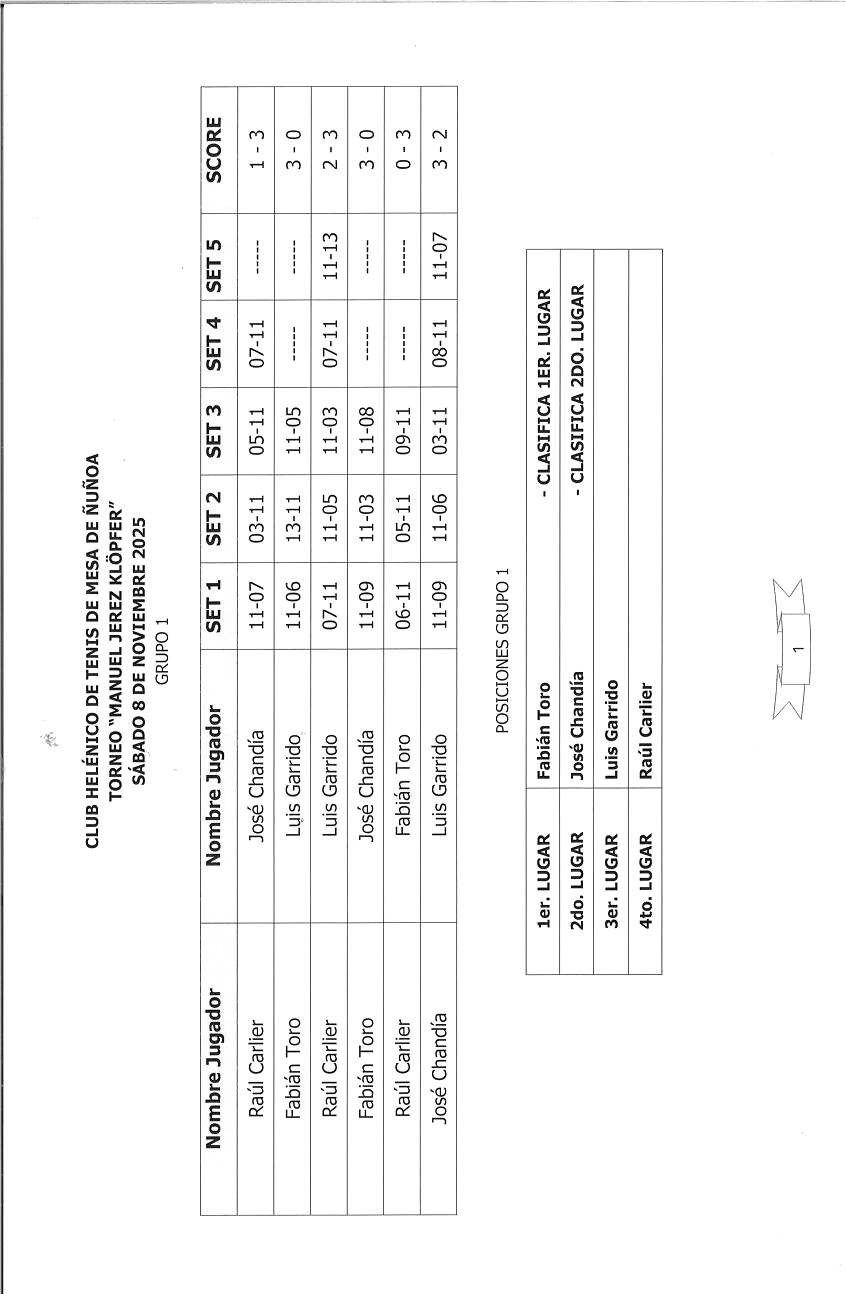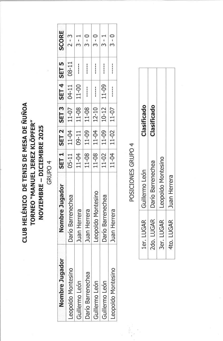 TORNEO DE TENIS DE MESA "MANUEL JEREZ KLÖPFER" (QEPD) ORGANIZA: CLUB HELÉNICO DE ÑUÑOA SÁBADOS NOVIEMBRE Y DICIEMBRE 2025 VER AQUÍ --> INFORMACIÓN SOBRE INSCRIPCIONES Y REGLAMENTO DEL TORNEO <-- VER AQUÍ VER AQUÍ --> INSCRITOS Y SORTEO DE GRUPOS <-- VER AQUÍ VER AQUÍ --> RESULTADO GRUPO 1 DEL TORNEO "MANUEL JEREZ" <-- VER AQUÍ --> RESULTADO GRUPO 2 DEL TORNEO "MANUEL JEREZ" <-- VER AQUÍ --> RESULTADO GRUPO 3 DEL TORNEO "MANUEL JEREZ" <-- VER AQUÍ --> RESULTADO GRUPO 4 DEL TORNEO "MANUEL JEREZ" <-- VER AQUÍ --> TORNEO MANUEL JEREZ : FOTOGRAFÍA INTEGRANTES GRUPO 1 <--VER AQUÍ VER AQUÍ --> TORNEO MANUEL JEREZ : FOTOGRAFÍA INTEGRANTES GRUPO 2 <--VER AQUÍ VER AQUÍ --> TORNEO MANUEL JEREZ : FOTOGRAFÍA INTEGRANTES GRUPO 3 <--VER AQUÍ VER AQUÍ --> TORNEO MANUEL JEREZ : FOTOGRAFÍA INTEGRANTES GRUPO 4 <--VER AQUÍ CUARTOS DE FINAL: SÁBADO 13 DE DICIEMBRE 2025 A LAS 16:15 HORAS EN AV. ELIECER PARADA 975 ÑUÑOA, (1) Fabián Toro VS. Olaf Trollund; (2) Ricardo Meza VS. José Chandía; (3) Juan Carlos Vargas VS. Darío Barrenechea y (4) Guillermo León VS. Héctor Llabulén