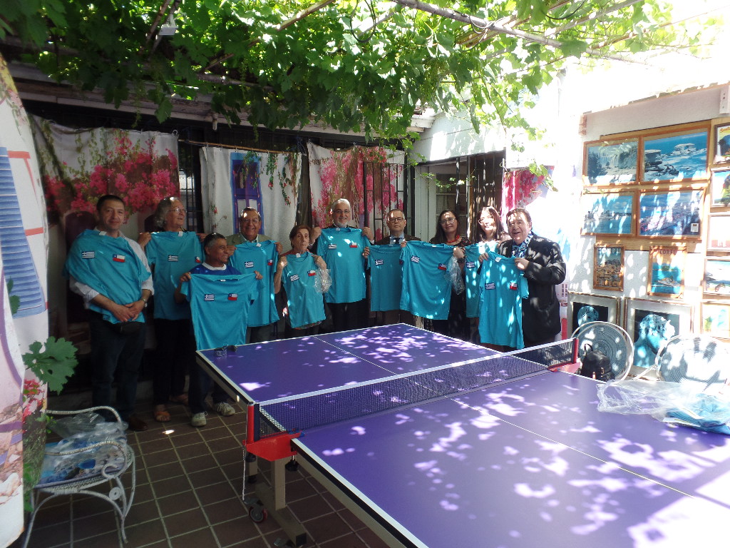 de las camisetas del Club Helénico de Ñuñoa a los presentes, de color
